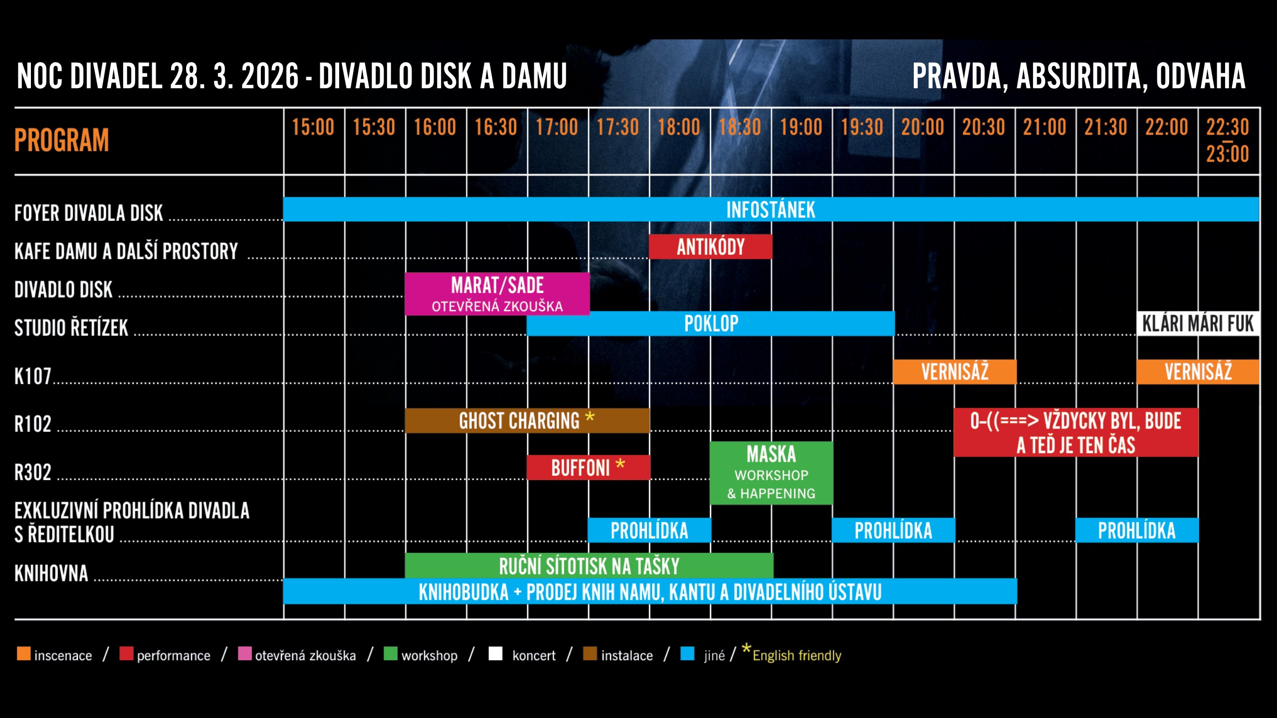 Prohlídka zákulisí divadla pro všechny, kteří mají „odvahu“: herecké šatny, sklady dekorací a rekvizit, truhlářská a zámečnická dílna, gotické sklepení se studnou i střecha divadla. Divadlo skrývá mnohé „absurdity“, tajemství a především „pravdu“, které vám během Noci divadel odhalí ředitelka divadla DISK Viktorie Schmoranzová.